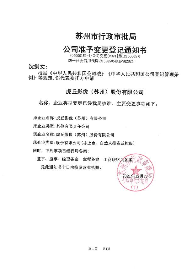 12月17日,經(jīng)蘇州市行政審批局核準,公司名稱正式變更為“虎丘影像(蘇州)股份有限公司”,此次變更,是虎丘影像在企業(yè)發(fā)展歷程和上市進程中又一里程碑。